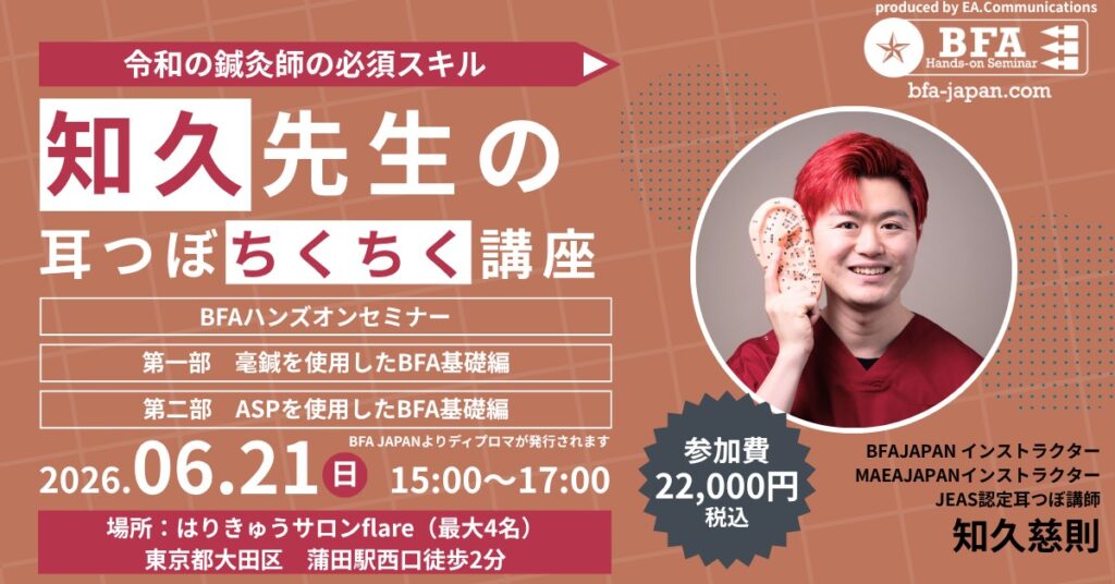 本セミナーでは「毫鍼を使用したBFA」と「ASPを使用したBFA」の両方のスキルを同時に学んでいただけるお得なセミナーとなっております。